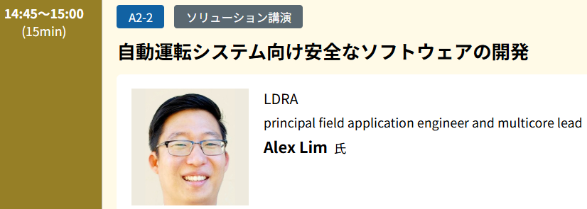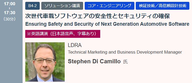 概要:SDV や ADAS 機能に対して、ISO 26262 は通常、より高いレベルの ASIL(自動車安全度水準)を割り当てており、安全性確保のために、より厳格な開発・検証・妥当性確認プロセスが求められる。本講演では、航空・宇宙業界で採用されてきた検証ツールによって、次世代車載ソフトウェアの提供と規格準拠をいかに加速できるかを示す。