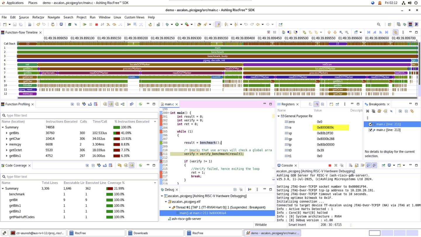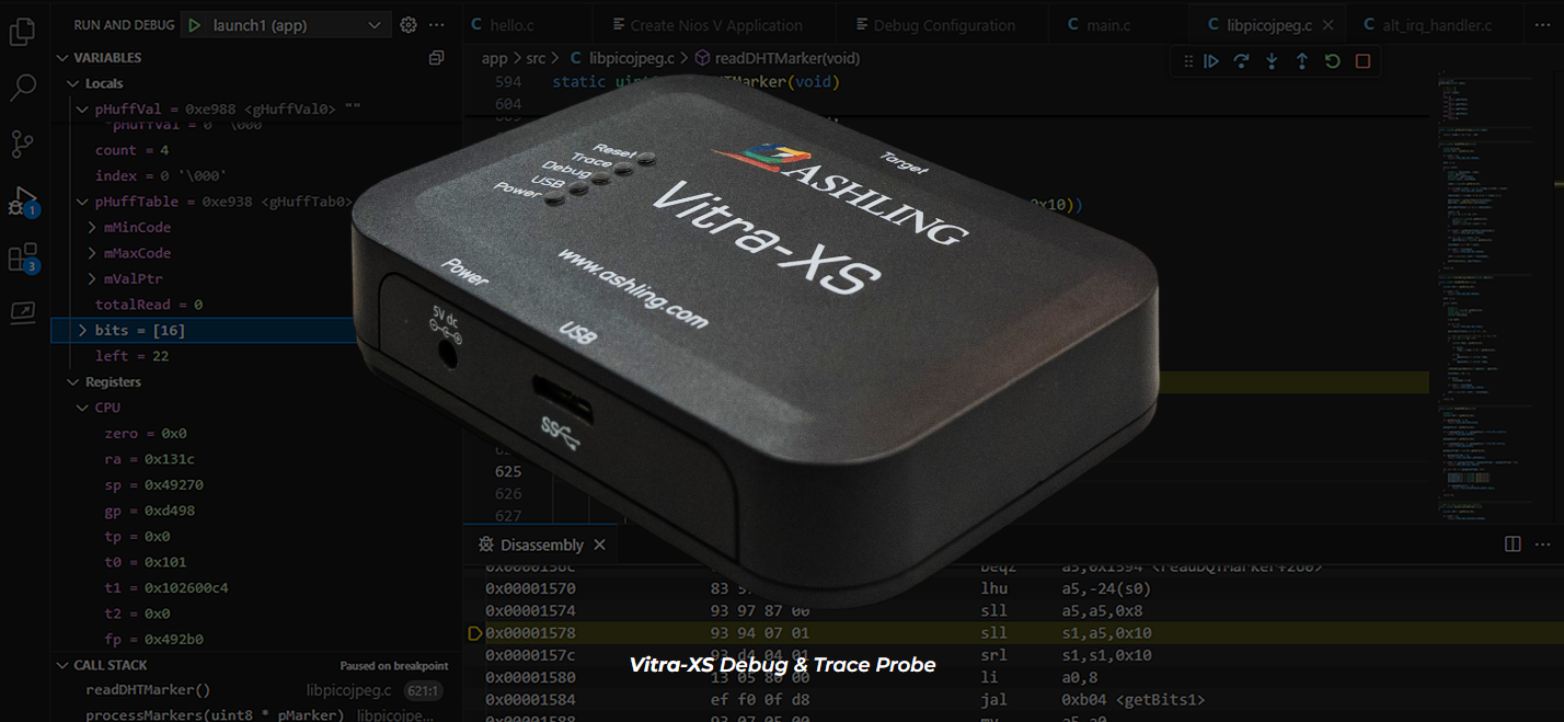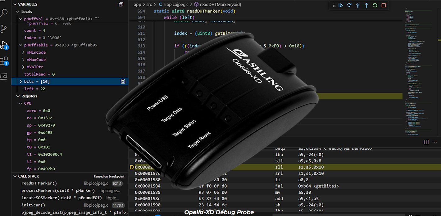 - Ashlingのハードウェアデバッグプローブ(Opella-XD)およびトレースプローブ(Vitra-XS)は、 RiscFreeデバッガに完全に統合されており、ハードウェアベースのデバッグ、トレース、プロファイリング、分析データの簡単なセットアップ、キャプチャ、表示を可能にします。
