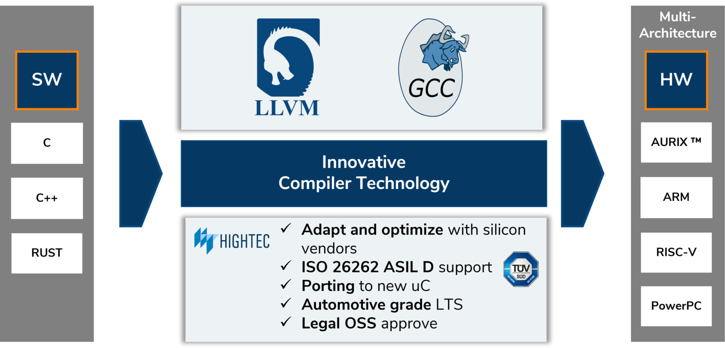 HighTec 社 は、GCC および LLVM ベースのオープンソース テクノロジを利用して、主要なマイクロコントローラ ファミリおよび組み込みマイクロプロセッサ向けの機能安全認定済み C/C++ コンパイラ スイートを開発しています。TriCore(Infineon AURIX microcontroller family TC2x, TC3x and TC4x)、Power Architecture (PowerPC)、ARM、RISC-V など、自動車および産業用アプリケーション市場をリードするマイクロコントローラをサポートして、組み込みソフトウェア開発のための最も信頼性が高くセキュアなツールを提供します。HighTec EDV Systeme は、1982 年の設立以来非公開企業であり、世界最大の商用オープンソースコンパイラベンダーです。