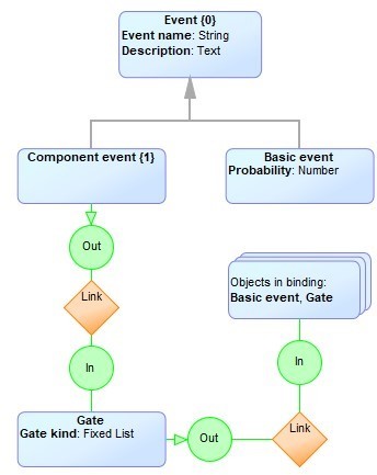 このメタモデルは僅かな要素から成りますが、それでも完全なFTA言語を定義しています。イベントには2つのタイプがあります。フォールトツリーのルートとして機能する「Component event」と、ある程度の確率でエラーを引き起こすいくつかの「Basic events」です。 どちらの要素にも、抽象スーパータイプ「Event」から継承される「Eventname」プロパティと「Description」プロパティがあります。 さらに、「Basic events」には、イベントが発生する可能性のある頻度を示す「Probability」プロパティがあります。 3番目の要素は、これら3つの要素間の関係を示す「Gate」です。 Gateには、ブール論理のAND、ORなどの値を持つ「Gatekind」プロパティがあります。 最後に、「Link」要素を使用すると、ルートコンポーネントイベントを「Gate」に関連付けることができ、それらを他のゲートまたは基本イベントに再度リンクできます。