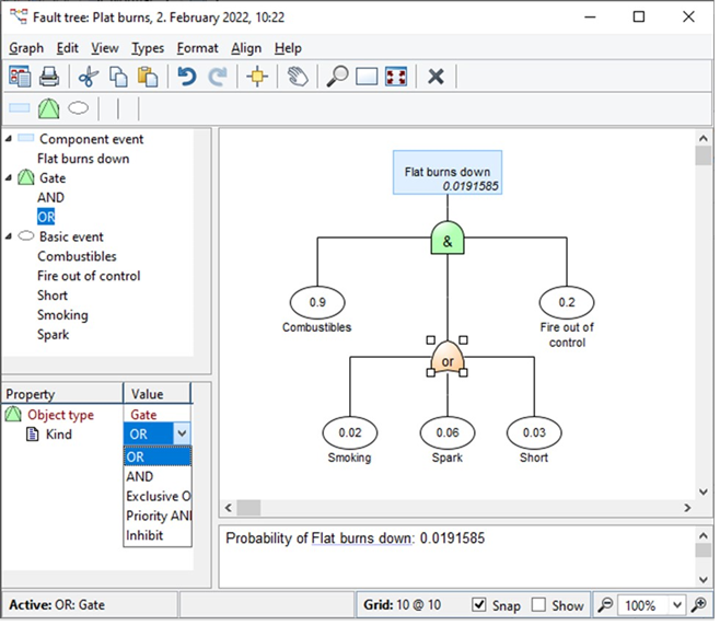 図3は、図2で定義されたメタモデルに基づくツールでのフォールトツリーモデリングの例を示しています。このモデリングエディタと関連機能は、言語定義に基づいて自動的に提供されます。 モデルの例では、「Flat burns down」は単一のルート要素であるコンポーネントイベントであり、5つの異なる基本イベントを持つ2つの異なるタイプのゲートがあります。 基本的なイベントには障害の可能性があるため、ツールはその後、コンポーネントの障害の確率を計算できます。