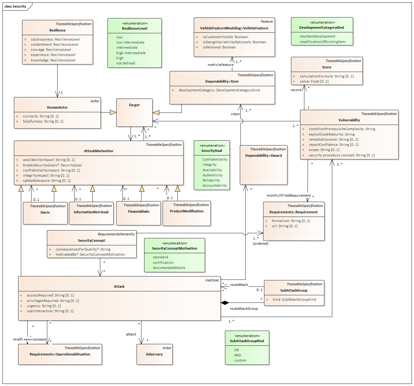 SAMは、AUTOSAR自動車規格に準拠したアーキテクチャ記述言語であるEAST-ADLのアーキテクチャモデルの一部であるモデリングエンティティ「Item」を介して、システムアーキテクチャ記述に密接にリンクしています[2]。 Itemは、自動車システムの多くの機能を指します。 SAMは、攻撃者の動機からセキュリティ違反まで、攻撃ベクトルのすべての重要な基準を提示しようとします。 これにより、ソフトウェア開発の初期段階でセキュリティの観点からシステムを表現できます。 「攻撃の動機 Attack motivations」に加えて、SAMは、「攻撃 Attack」のすべての本質的および時間的特性、たとえば、セキュリティ目標(機密性、可用性、完全性など)への影響、攻撃の複雑さ、影響を受けるオブジェクト、および「脆弱性 Vulnerability」についても説明します。 最新バージョンのSAMは、ソーシャルエンジニアリング攻撃にも対応しています[1]。