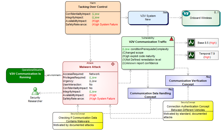 - モデルが同じメタモデルを共有すると、現在設計されているシステムの初期安全モデルを自動的に作成するなど、モデルチェックとモデル変換を実行できます。 このように、安全エンジニアはすべての安全モデルを手動で作成する必要がなく、安全分析が計画されたシステムに基づいていることをより確実にすることができます。 トレース機能により、計画されたシステムで行われた変更を追跡することもできます。 また、セクションIIIの例で説明するように、脆弱性スコアを計算するなど、セキュリティの側面を分析できます。