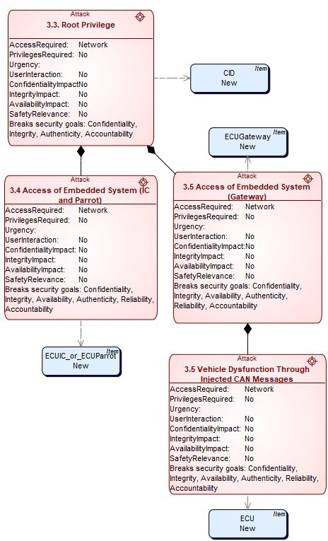 ここでは、攻撃の動機とアイテムのリンクが中心的な役割を果たします。 これは、攻撃によってどのアイテムが危険にさらされているかを考慮することから始めます。 レベル1では、詳細はまだわかっていないため、アイテムは包括的な用語である可能性があります。 たとえば、特定の攻撃では車のバスシステムを攻撃する必要があることが知られています。 ただし、影響を受けるアイテムを正確に特定することはまだできません。 したがって、アイテムのグループを含む「bus system」アイテムを作成できます。 ただし、このアイテムは他の自動車用ソフトウェアアーキテクチャへの接続を形成するため、指定する必要があります。 このアイテムがないと、脅威のモデリングは切り離され、他のアーキテクチャとの関連性がなくなります。