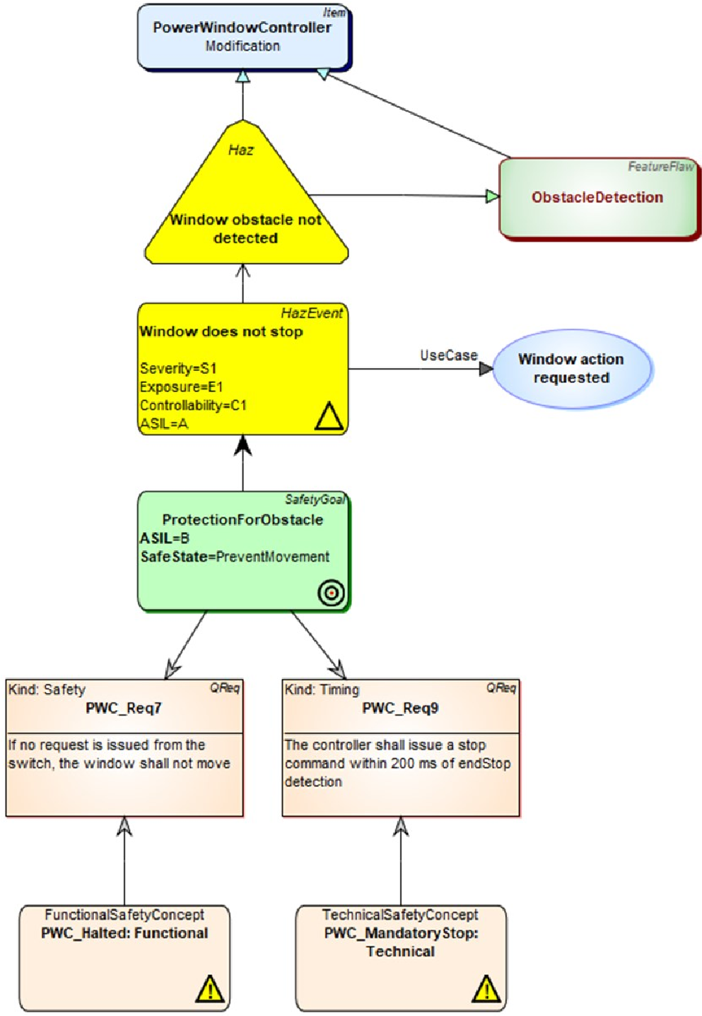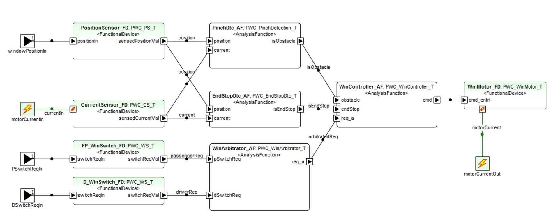 Power Windowの機能は、その機能アーキテクチャとともにシステムズエンジニアによって定義されます(図12を参照)。 フィーチャーモデルの各フィーチャーは、機能アーキテクチャの個々の要素にマップされます。 これにより、システム設計と安全設計の間のトレーサビリティが可能になります。