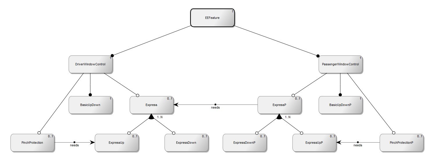 統合されたメタモデルのおかげで、安全設計はシステムモデリングから分離されていません。 統合は、メタモデルに従って、1つ以上の機能を参照できるPowerWindowControllerと呼ばれる「Item」によって実現されます。 この例では、このアイテムは車両のPowerWindow機能を参照しています。 この機能は、EAST-ADLのフィーチャーモデルで定義されており、図11に示されています。