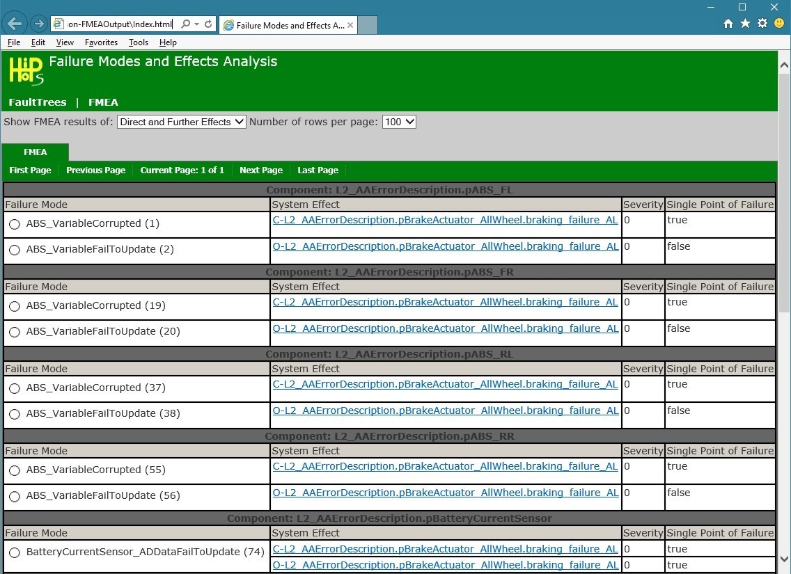 エラーモデリングを使用すると、安全エンジニアは実際のシステム設計を変更することなく、さまざまな障害や障害ロジックを指定できます。 それでも、エラーモデルから名目上の計画されたシステムの説明へのリンクがあります。 エラーモデルは障害ロジック(ブールおよび時間)を指定できるため、モデルは自動化されたフォールトツリー分析(FTA)および故障モード影響分析(FMEA)の基礎としても機能します[8][13]。 これは、(前の図3のように)手動でフォールトツリー図を作成するのではなく、それらが生成されることを意味します。 この目的のために、エラーモデルを、FTA/FMEAツールに必要な形式に変換するモデル変換を実装しました。 変換が完全に自動化されているため、FTAとFMEAを実行するためのコストと労力が大幅に削減されます。 図14は、エラーモデルからFMEAの分析ツールへの変換を実行した結果を示しています。