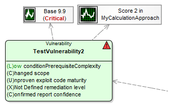 注:図 9 では、"calculationFormula" を持つ スコア要素はありません。ユーザーはスコア要素を追加してから、使用するスコアを選択できます。 CVSS Base が選択された場合 (右図の値 9.9 のように)、MetaEdit+ はモデル データに基づいて値を計算します。 ユーザーは、右図の「2」のように独自の値を入力してから、独自の計算基準を説明することもできます 。 MetaEdit+ のメタモデルでは、ユーザーは独自の電卓を実装することもできます。