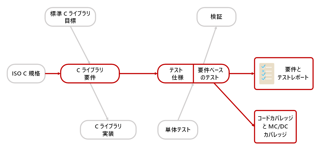 ライブラリのコードはアプリケーションとリンクしてターゲットデバイス上で実行されます。そのため、ライブラリコンポーネントに欠陥があるとアプリケーション全体の機能安全が危険にさらされるので、ソフトウェアライブラリの認定が不可欠です。ソフトウェアライブラリの使用に対して機能安全規格それぞれで独自の目標がありますが、一般的には、ライブラリの実装がその仕様に準拠していることを検証するという目標は共通です。