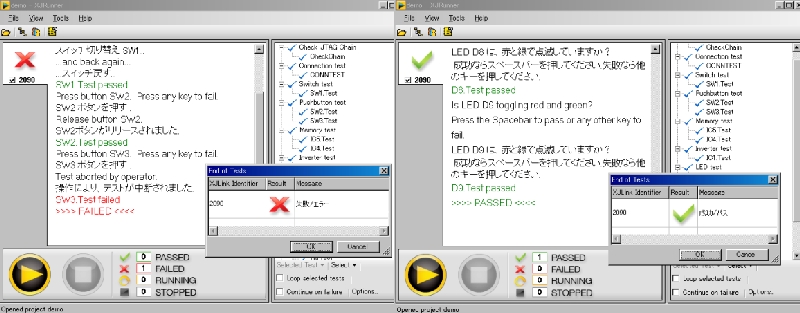 XJRunは、XJTAGのテストセットアップ内で個別のテストまたはテストのグループを実行するように構成できます。XJRunから返された値を使用して、制御ソフトウェアの機能に応じて、単純な結果(成功/失敗)、あるいはエラーの詳細情報をレポートします。