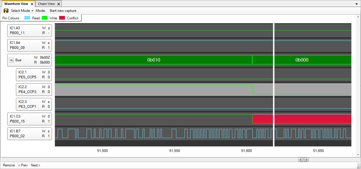 バウンダリスキャンは信号遷移をリアルタイムでキャプチャすることはできませんが、Waveform Viewerはスキャンチェーンによってキャプチャして、ロジックアナライザタイプのビューでシステムのデジタルアクティビティを表現します。これにより、デバッグおよび障害診断を強化します。